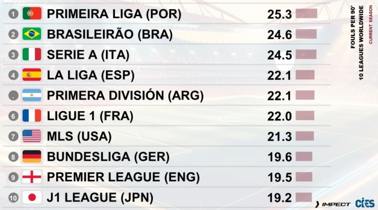 CIES Football Observatory đã tổng hợp số liệu thống kê về số lần phạm lỗi ở các giải đấu trên khắp thế giới cứ sau 90 phút. Giải VĐQG Bồ Đào Nha đứng đầu với 25,3 lỗi và giải Ngoại hạng Brazil đứng thứ hai với 24,6.