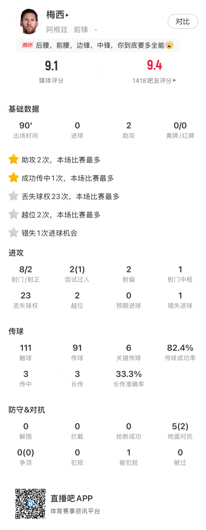 Số liệu thống kê toàn trận của Messi: