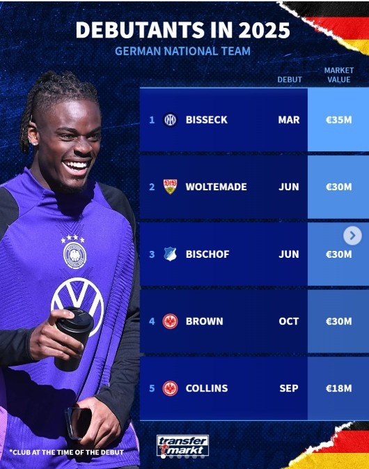 Sau đây là giá trị của các cầu thủ sẽ ra mắt đội tuyển Đức vào năm 2025 (thời điểm ra mắt là câu lạc bộ họ đang thi đấu vào thời điểm đó):